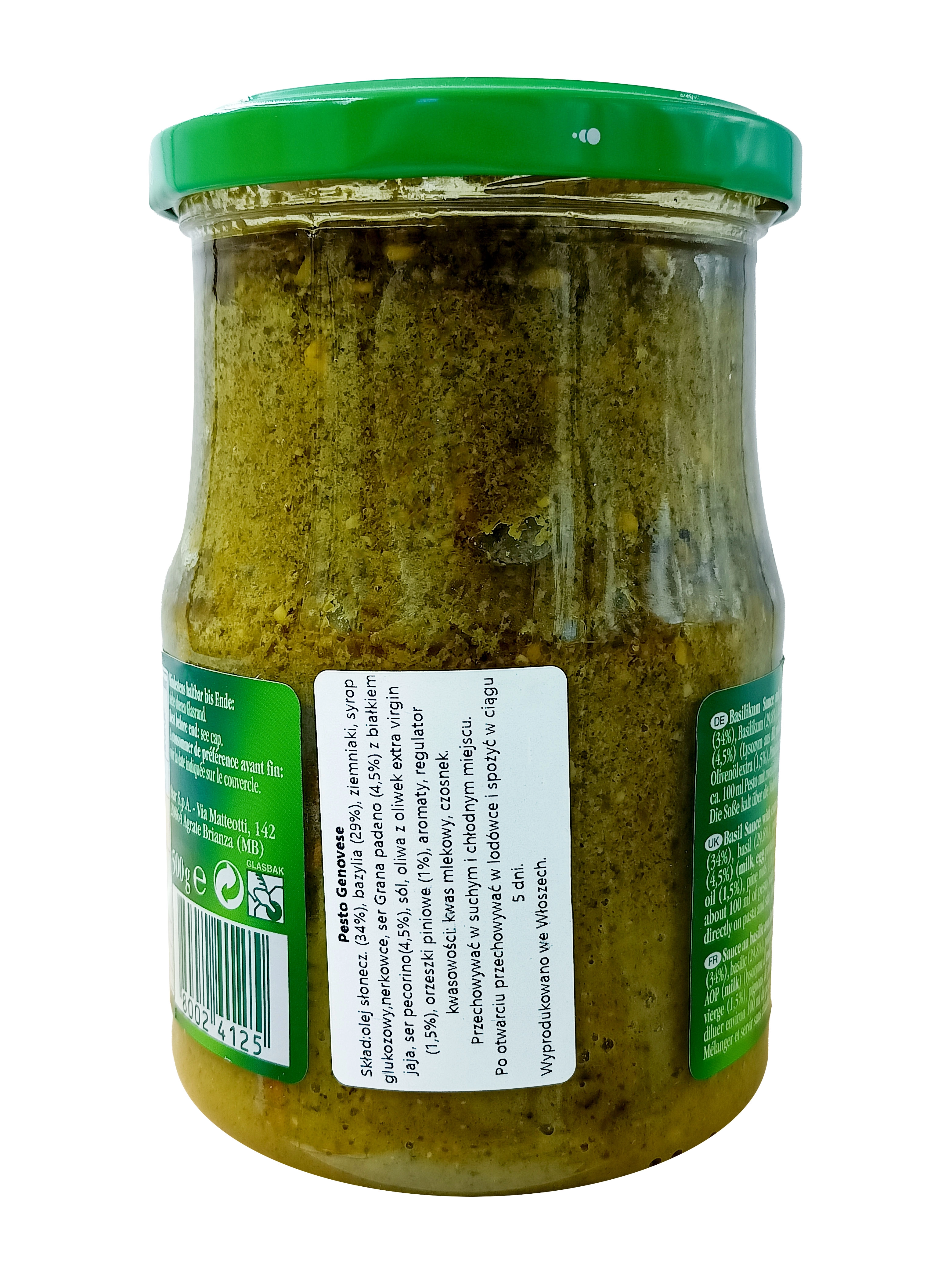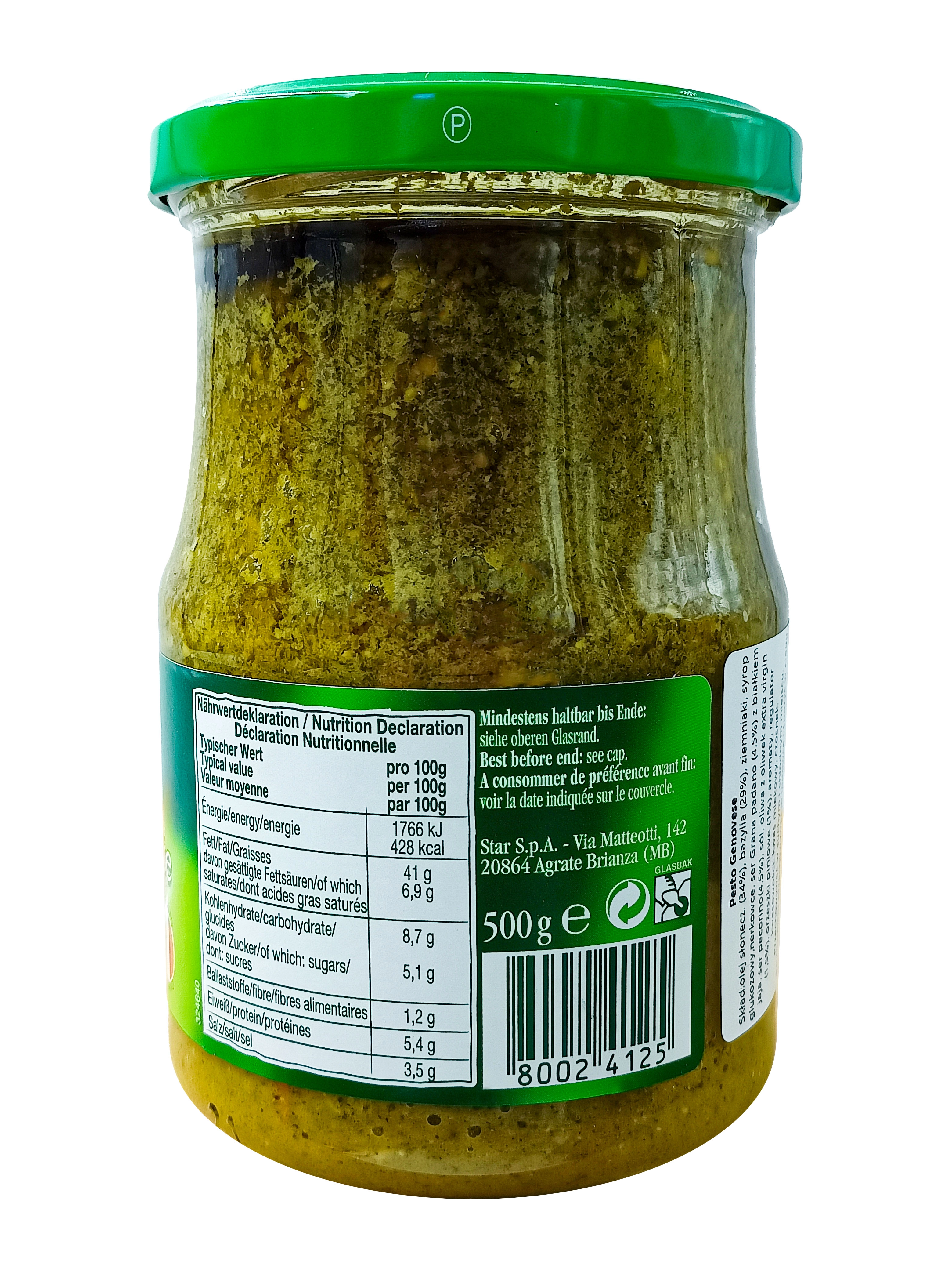 Olej słonecznikowy (34%), bazylia (29,8%), ziemniaki, syrop glukozowy, orzeszki pini, ser grana padano (4,5 %), ser pecorino romano (4,5%), sól, oliwa z oliwek extra vergine (1,5%), regulator kwasowości.