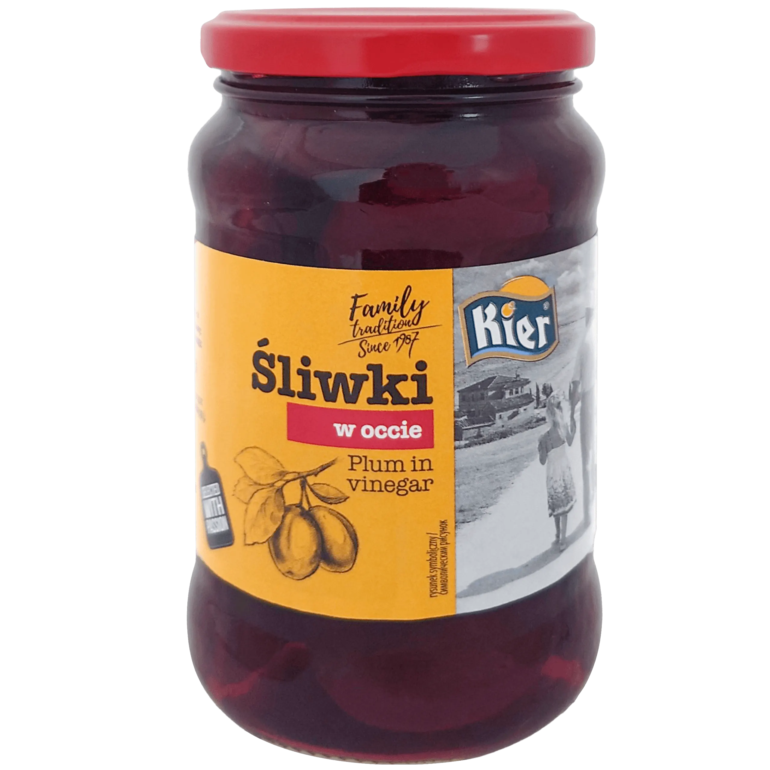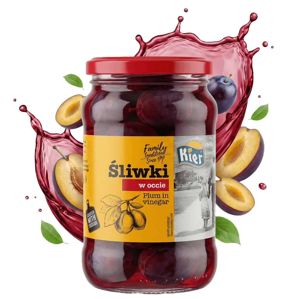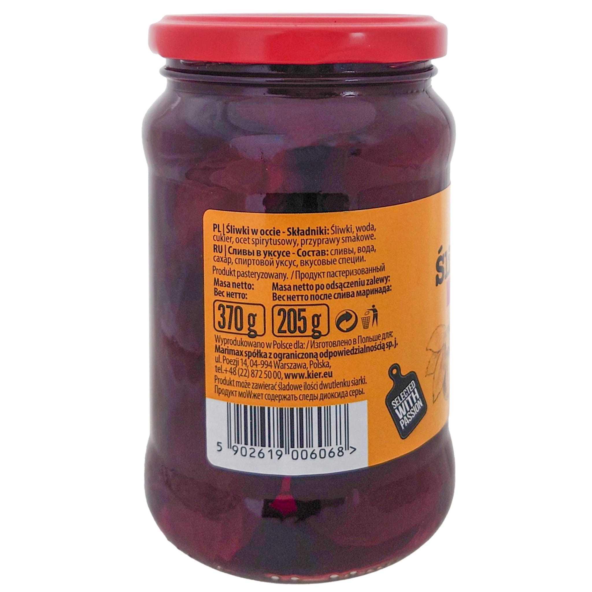 Śliwki w occie, zamknięte szczelnie w zalewie na bazie octu winnego,cynamonu z dodatkiem czerwonego wina i goździków. Śliwki w occie idealnie łączą się z sałatkami i wędlinami. Dodane do sera przełamią ich naturalny smak i dadzą inny, bardziej wyrazisty walor smakowy. Jest to pyszny dodatek do mięsnych, pieczonych potraw. Można je użyć do robienia słynnych koreczków na różne okolicznościowe imprezy lub innych pysznych potraw.
